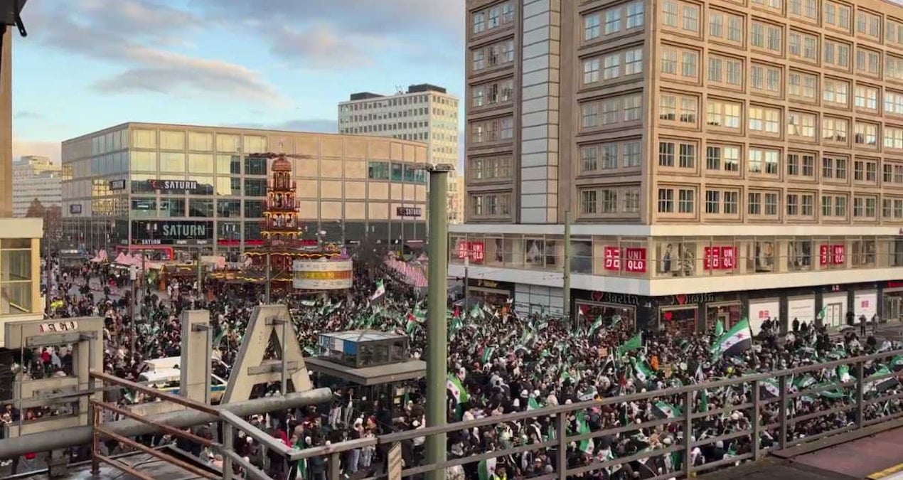 Alman basınına göre 2 binden fazla Suriye’li Berlin’de Alexanderplatz’da toplanarak bayraklar salladı, kutlama yaptı. Grup, daha sonra Zafer Anıtı’na kadar yürüdü.