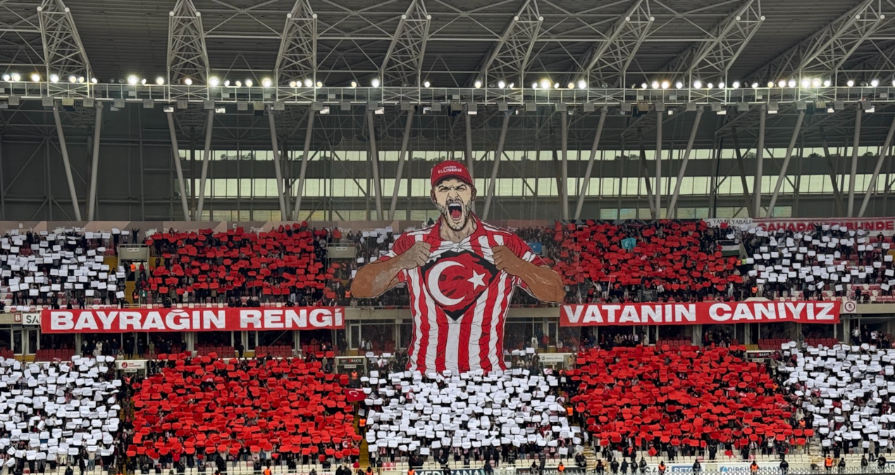 4 Eylül Stadyumu’nda oynanan maç öncesi Sivasspor taraftarları tribünlerde kırmızı, beyaz kartonlarla görel şölen oluşturdu.
