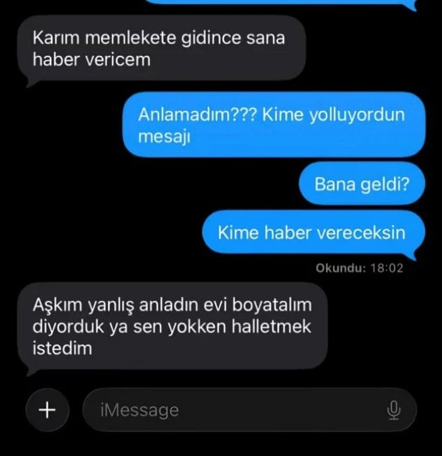 Adam eşine, “Karım memlekete gidince sana haber vericem” yazılı bir mesaj gönderdi. Mesajı okuyan kadın eşine, “Anlamadım??? Kime yolluyordun mesajı” karşılığını verdi.